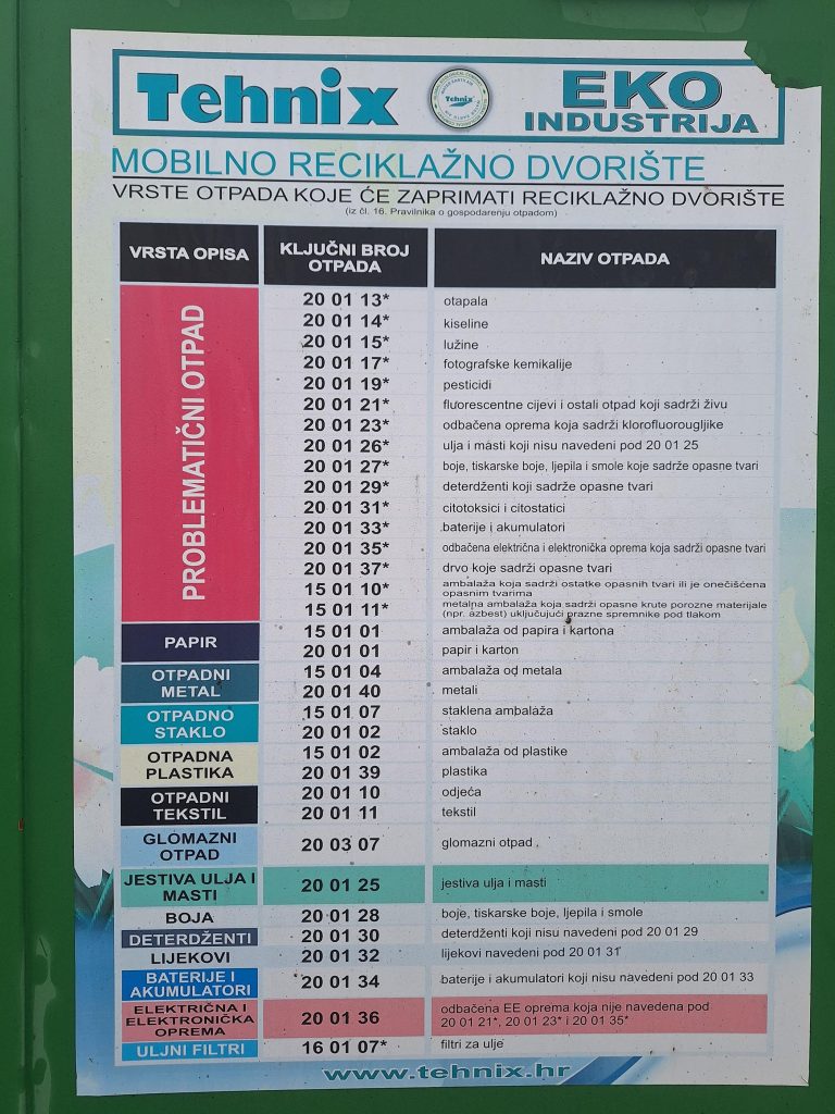 Adrese i radno vrijeme mobilnog reciklažnog dvorišta za 2025. Godinu možete pogledati OVDJE, dok se popis otpada iz kućanstava koji se može odložiti u mobilno reciklažno dvorište nalaze u dokumentu: